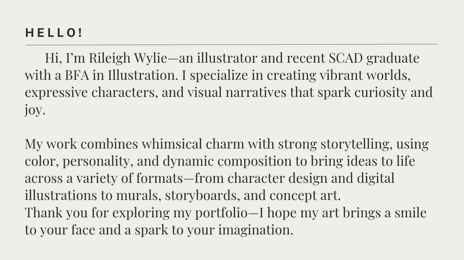 I am a prospective graduate in Illustration from the Savannah College of Art and Design (SCAD), specializing in digital illustration and driven by a profound enthusiasm for creative design. My expertise encompasses character and prop design, storyboarding, and concept art, with a keen focus on contributing to the film, television, and publication sectors.